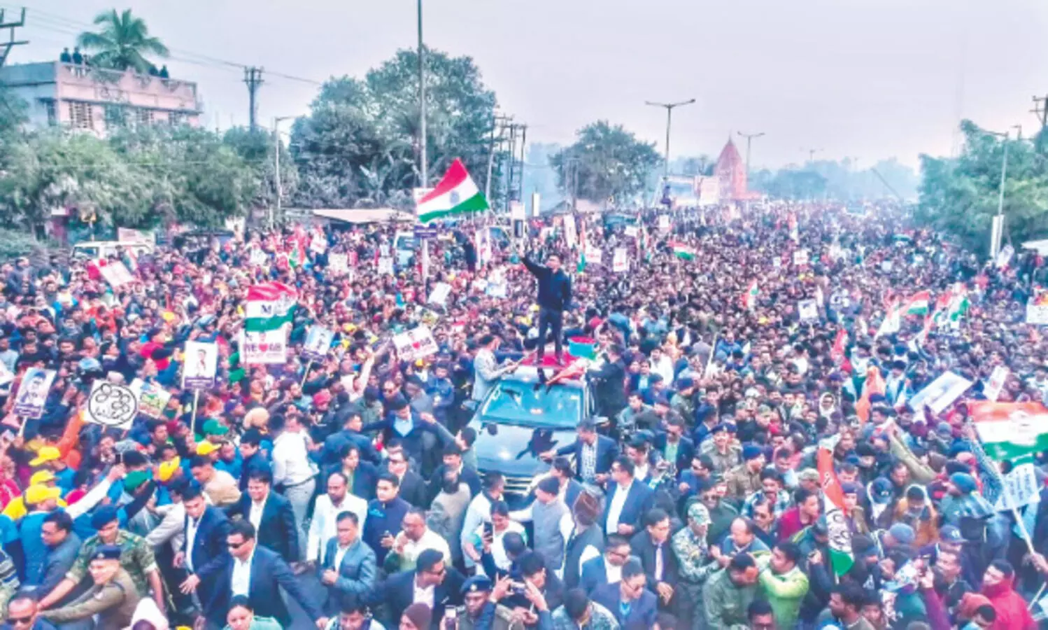 Abhishek led a nearly one-kilometre roadshow along NH-12 in Itahar, drawing a massive crowd, before addressing a public meeting at Chowrasta More.