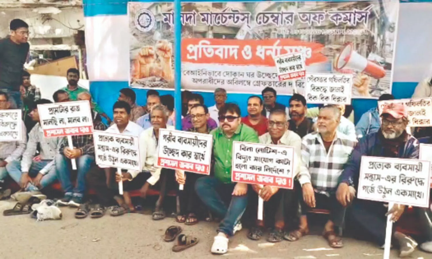 Malda: Tension gripped Malda town as traders staged a sit-in protest along the National Highway following the demolition of multiple shops in the early hours of Monday. The agitating business community has warned of a district-wide bandh on Saturday if the prime accused, promoter Rajib Sharma, is not arrested within two days.