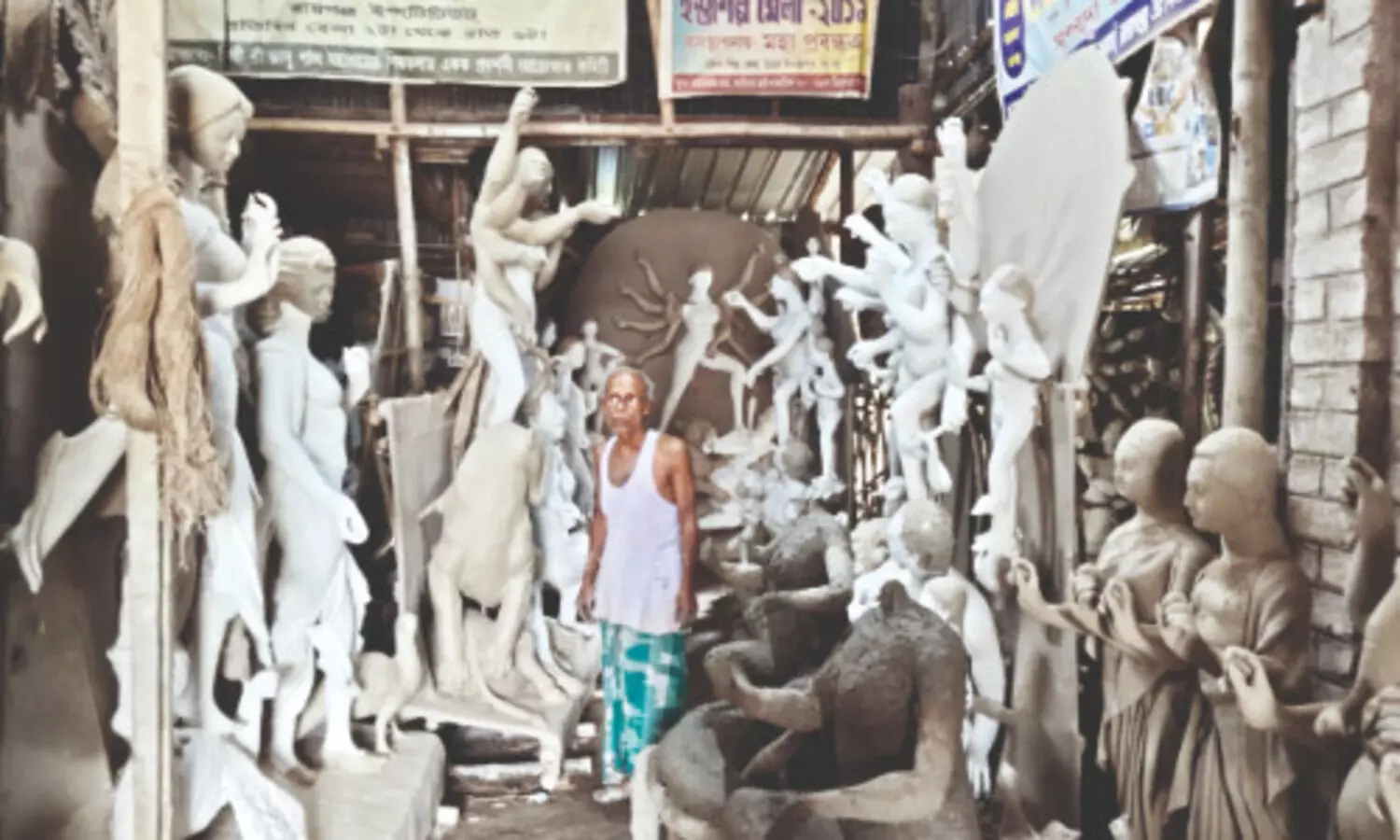 Raiganj: The artisans of Raiganj in North Dinajpur district are facing significant challenges this year in preparing Biswakarma idols, which may lead to a scarcity in the market. With only a gap of about 10 days between Biswakarma Puja and Durga Puja, many workshops are struggling to find adequate space to accommodate both idols under a single roof.