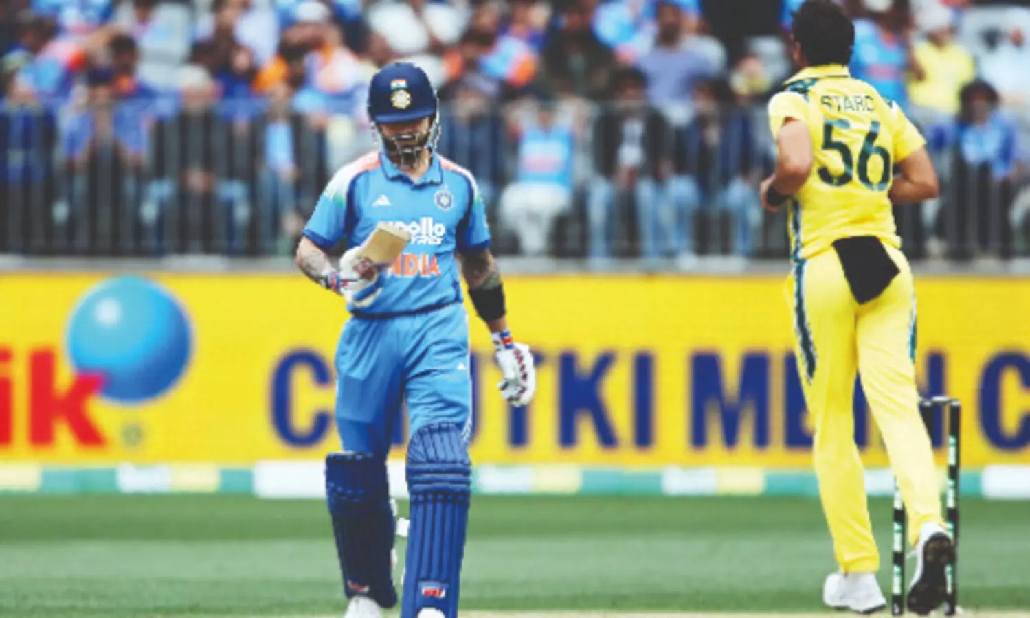 Virat Kohli’s return fared worse. Walking in to loud cheers, the former captain endured a brief and uneasy stay. Starc tempted him with deliveries outside off, and the plan worked. Kohli’s attempted drive on the up resulted in a sharp catch by Cooper Connolly at backward point, sending him back for a duck — his first ever in Australia.