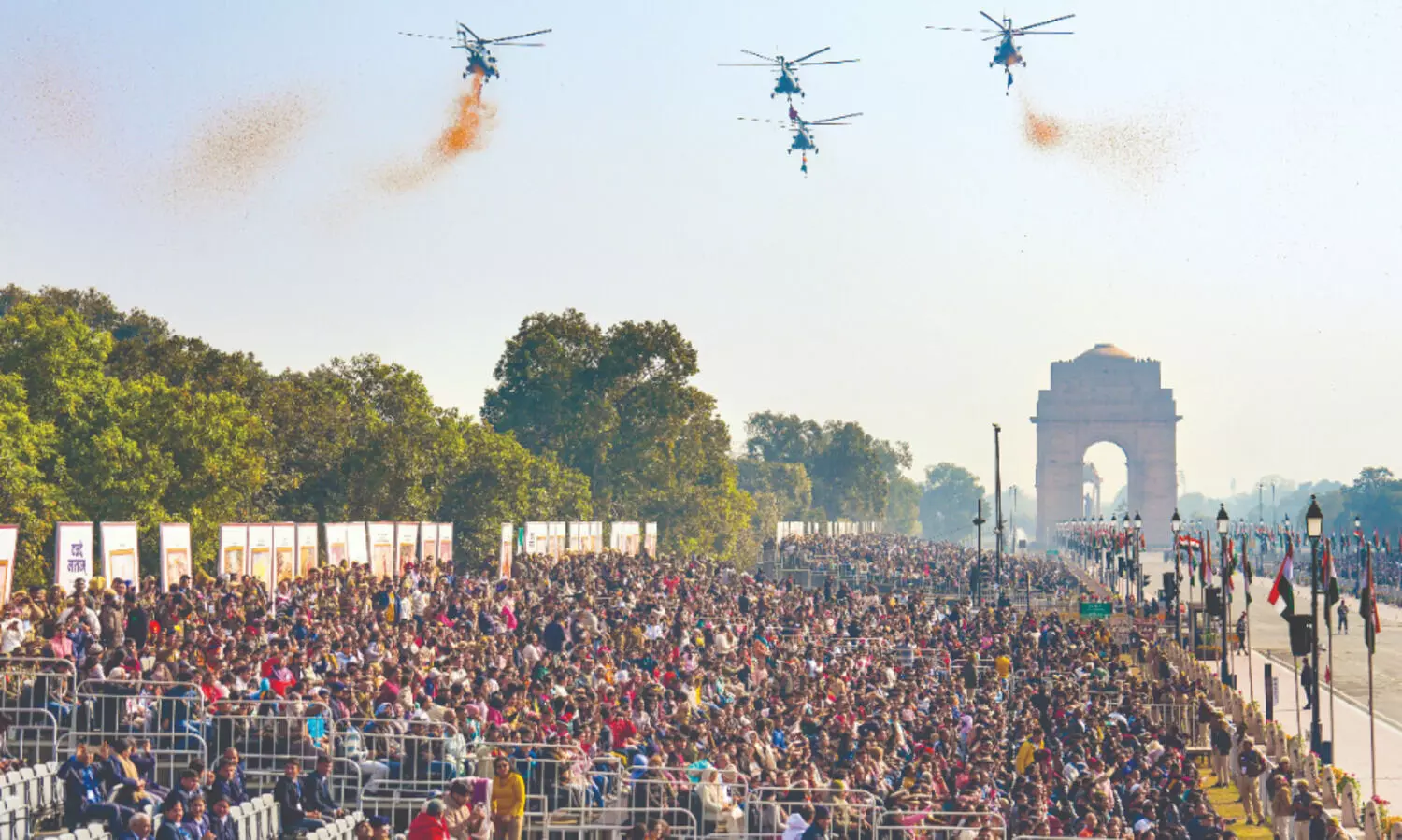 This year’s spectator enclosures were named after rivers from across the country, including the Beas, Brahmaputra, Chambal, Chenab, Ganga, Godavari, Krishna, Narmada, Sutlej, Yamuna and several others, reinforcing a nationwide motif that ran through the celebrations.
