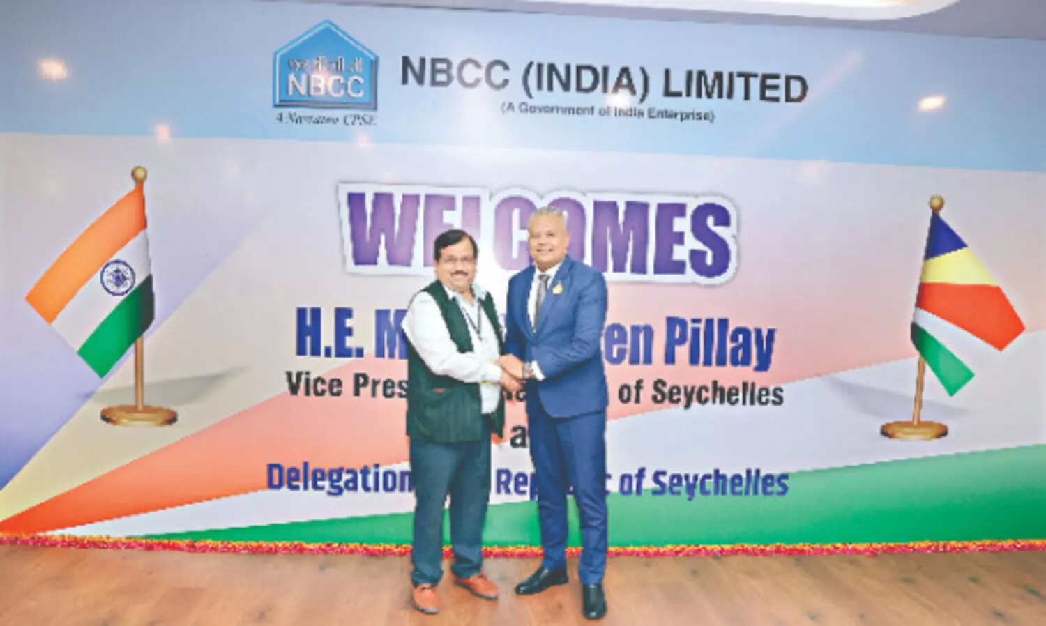 The Vice-President of the Republic of Seychelles, Sebastien Pillay, visited the headquarters of NBCC (India) Limited in New Delhi leading a high-level delegation. The Seychelles delegation held detailed discussions with K P Mahadevaswamy, CMD, NBCC and other senior officers of the company regarding projects in Seychelles. During the meeting, comprehensive presentations were made to the delegation outlining infrastructure development for an area of about 139 acres of an island. The proposed development would include affordable social housing, leisure & hospitality, premium villas, sports arena, social infrastructure etc.