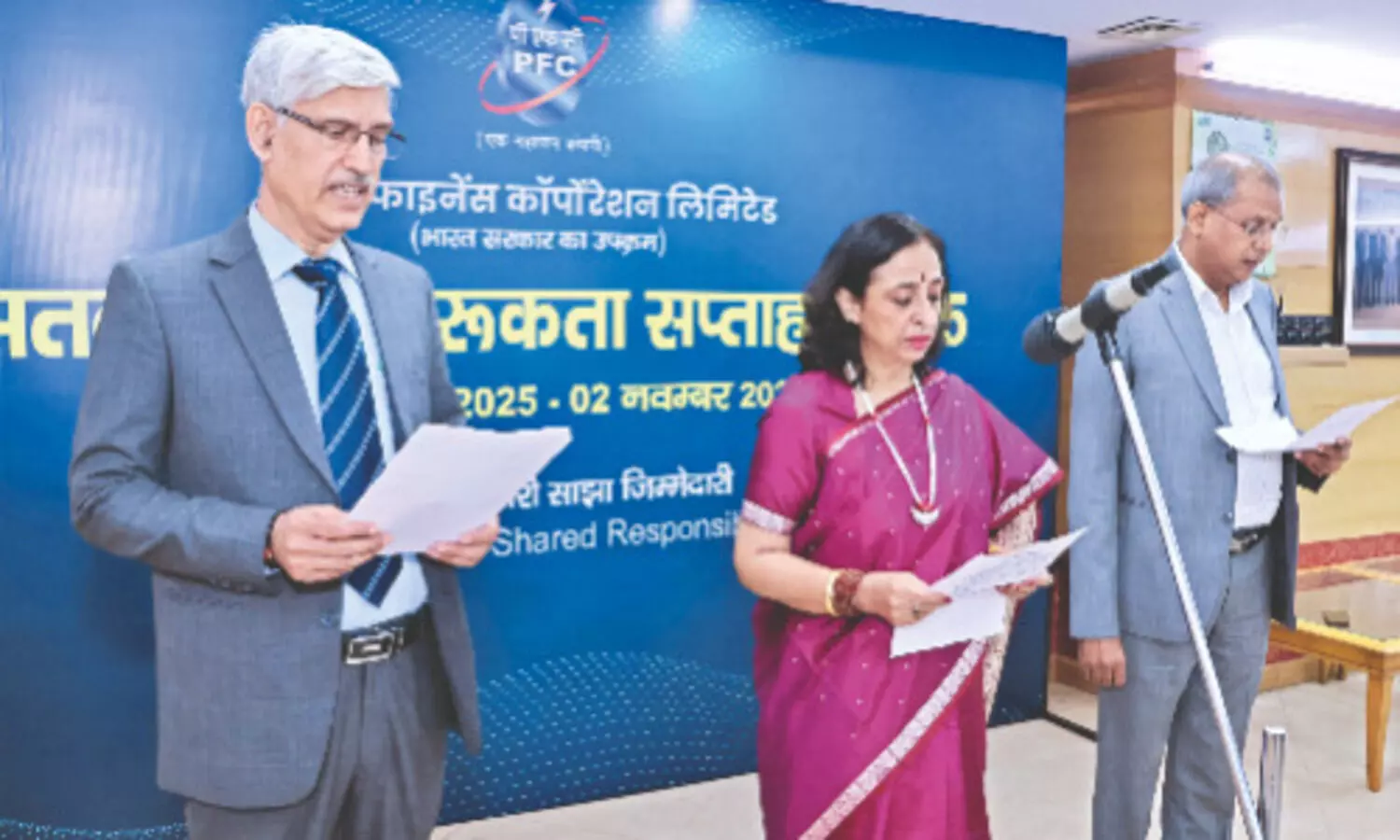 Simmi R. Nakra, Chief Vigilance Officer (CVO), administers the Integrity Pledge to employees and officials of Power Finance Corporation Ltd, in the presence of Manoj Sharma, Director (Commercial), and Sandeep Kumar, Director (Finance)
