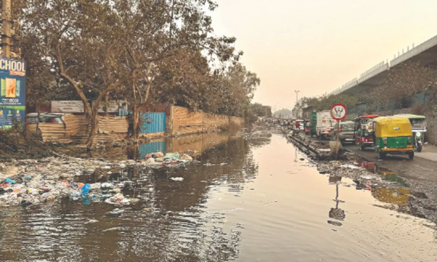 New Delhi: Winter has tightened its grip on Delhi, long after the monsoon drained away and the Yamuna retreated to its lean seasonal channel. But in Shaheen Bagh, water refuses to recede. Near Okhla’s N Block, a stretch of over 100 metres has once again turned into what residents describe as a dangerous, open manhole. Dark, foul-smelling water blankets most of the road, carrying floating plastic, food waste and an oily sheen. The drain has merged invisibly with the carriageway, making it impossible to distinguish where the road ends and open sewers begin.
