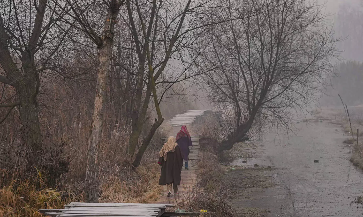A thick layer of fog engulfed Srinagar and most other parts of the Valley on Saturday morning, especially near the water bodies.