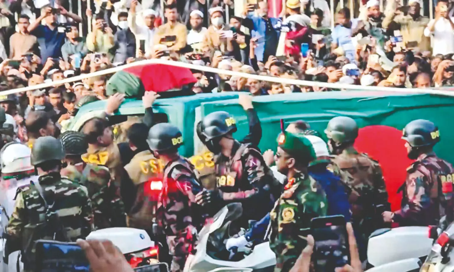 Zia’s coffin, draped in the national flag, was brought to the funeral site in a convoy from her residence. Thousands of mourners gathered outside the parliament complex to have a last glimpse of their beloved leader. Many Bangladesh Nationalist Party (BNP) supporters were seen carrying flags featuring Zia’s photographs.