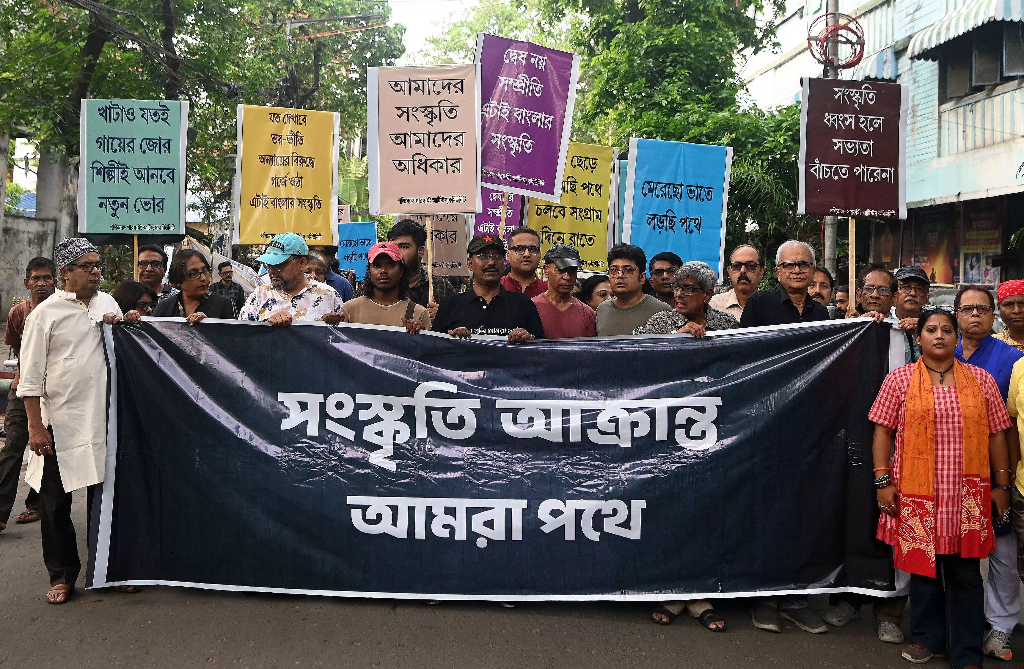 The protesters accused the Centre of using policy changes and funding cuts as tools to curb dissenting voices. As per the Guru-Shishya Parampara (Repertory Grant) scheme for 2024–25 and 2025–26, groups that have received funding for five straight years must now take a two-year cooling-off period. This rule does not apply to those linked to Padma awardees or working to preserve folk and traditional art forms. Organised by the West Bengal Performing Artistes Community, the protest march from Tapan Theatre to the Academy of Fine Arts saw participation from both senior and young theatre personalities, including Soumitra Mitra, Seema Mukhopadhyay, Goutam Haldar and Dulal Lahiri. Veteran thespian Chandan Sen termed the move “politically motivated,” alleging that attempts to influence artistic expression were not new.