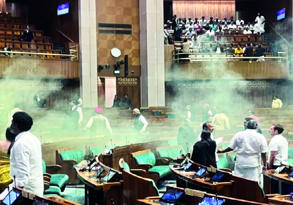 In a major security breach on the anniversary of the 2001 Parliament terror attack, two persons -- Sagar Sharma and Manoranjan D -- jumped into the Lok Sabha chamber from the public gallery during Zero Hour, released yellow gas from canisters and shouted slogans before being overpowered by the MPs.