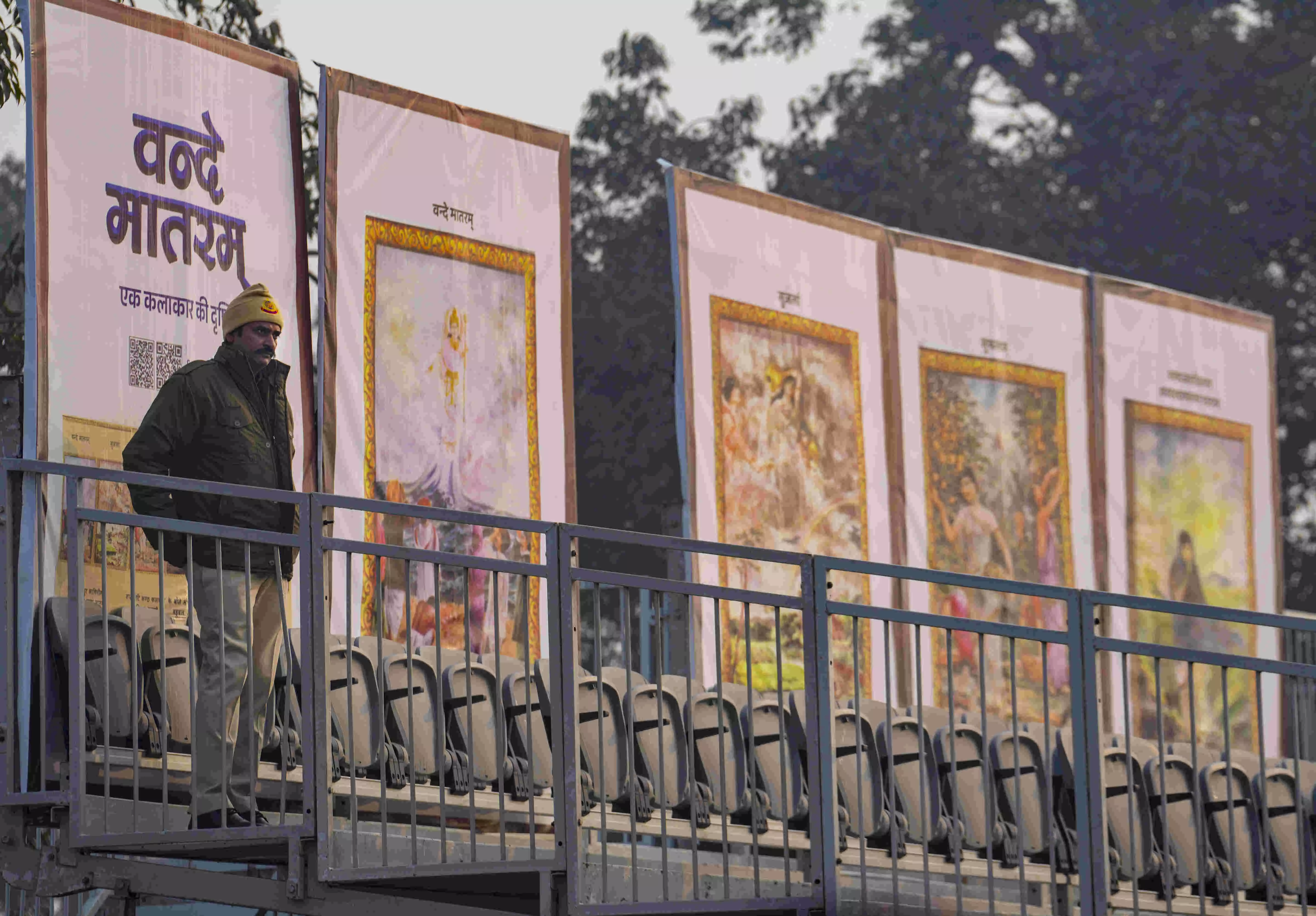 New Delhi: Prints of old paintings by artist Tejendra Kumar Mitra, illustrating the opening stanzas of 'Vande Mataram', adorned the enclosure backdrops along the Kartavya Path at the 77th Republic Day Parade here. Written in 1875 by Bankim Chandra Chatterjee, 'Vande Mataram' had turned into a rallying cry during the freedom movement. It was adopted as India's national song by the Constituent Assembly in 1950.